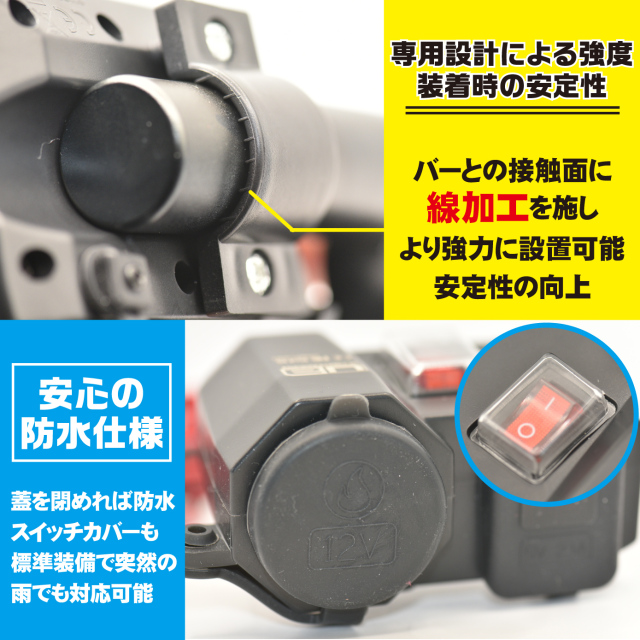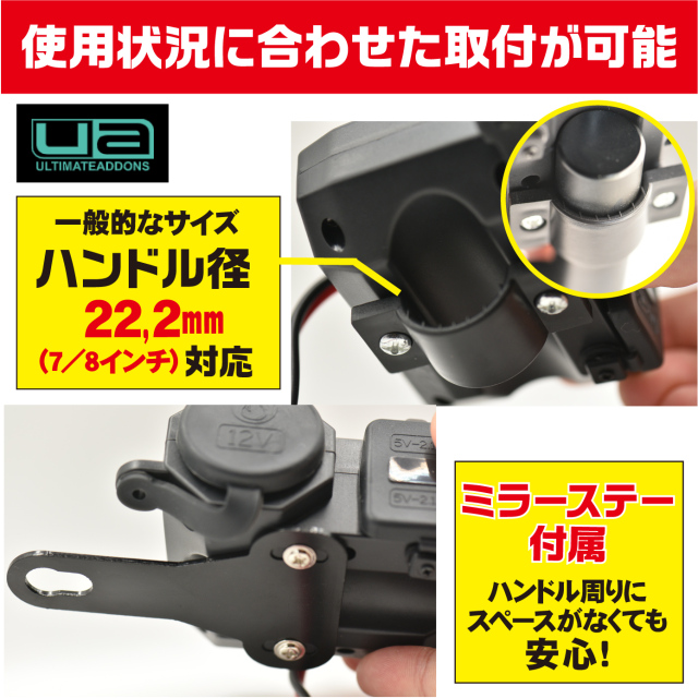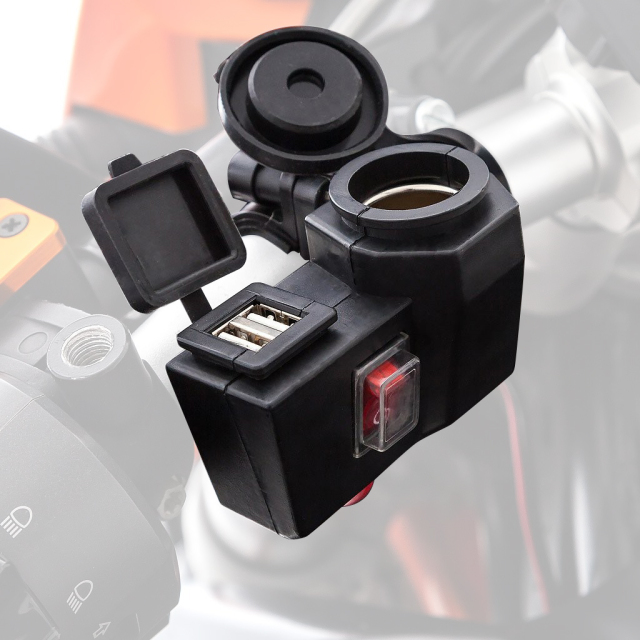【USB2ポート+シガーソケット】シガーソケットとUSB端子が同時に使える。 【インテリジェンスポート】2ポート合計で5V/3.1A出力。 【電源スイッチ付き】使用しない時はOFFにして無駄な電力消費を防止。 【防止仕様】防水仕様のキャップ付きで雨や砂ぼこりの侵入を防ぐ。 【付属品】スペアヒューズ×1、結束バンド×4、ハンドル固定用クランプ、貼付用両面テープマウント シガーソケットとUSB端子が同時に使用可能。 1ポートのみ使用の場合、2.1A出力です。2ポート同時使用の場合、1ポート目(最初に繋いだ端子)が2.1A、2ポート目は1Aとなります。 単独スイッチ付きで無駄な電力消費を防ぎ、バッテリー上がりを回避。 付属の調整ゴムを使用して19.0mm~28.0mmまでのハンドル径に取り付け可能。 取付方法はハンドルクランプと貼付式の2通り。 防水仕様キャップ付きで雨や砂ぼこりの侵入を防ぎます。 使用上の注意 ※キャップを開けた状態では防水仕様ではありません。※洗車・豪雨時のご使用はお控え下さい。※未使用時には必ず付属のゴムキャップをお閉め下さい。